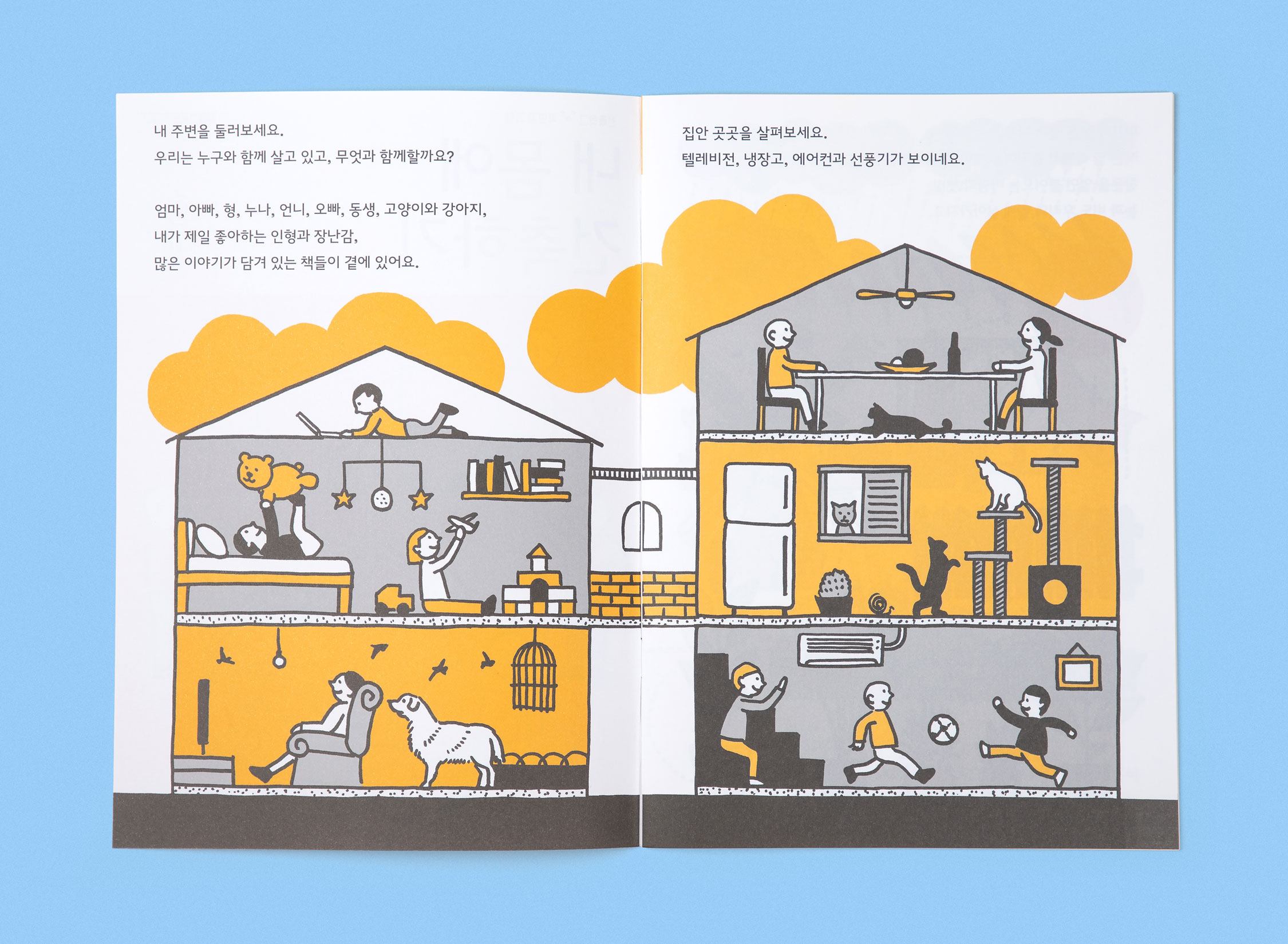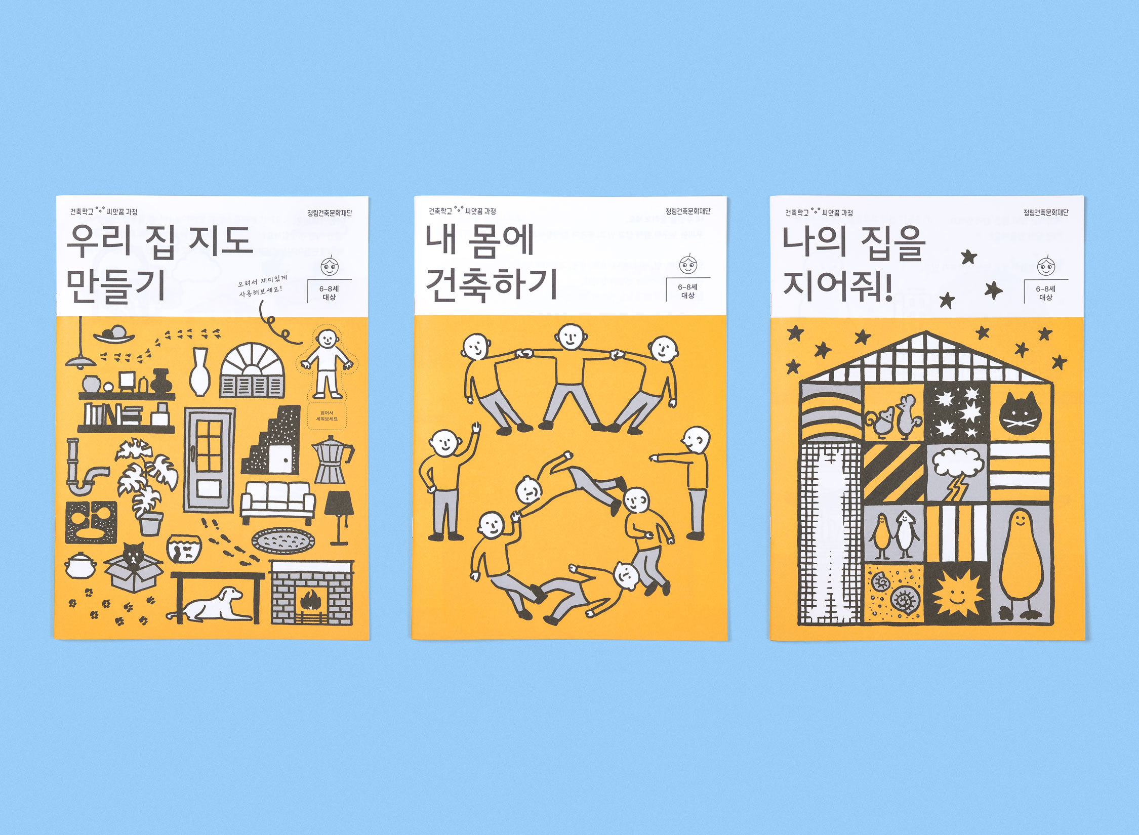 We designed the educational kit for Architecture School, an educational program run by the Junglim Foundation. Architecture School aims to help children and teenagers observe their everyday surroundings and develop independent thinking through architecture. In celebration of the program’s 10th anniversary in 2022, we carried out a full visual identity renewal and designed a new educational kit. This project sought to harmonize the objective, logical thinking inherent to architecture — with its emphasis on structure and materials — with the warm, gentle spirit of education for children. Using the existing Architecture School logo, we developed a simple yet versatile graphic pattern and created a set of playful character icons representing students, which were applied across packaging and promotional materials. We also incorporated hand-drawn illustrations throughout the teaching materials to make the content easier to understand and more engaging. We hope that every child and teen who takes part in Architecture School will come to imagine their everyday spaces in richer and more delightful ways. 🏠