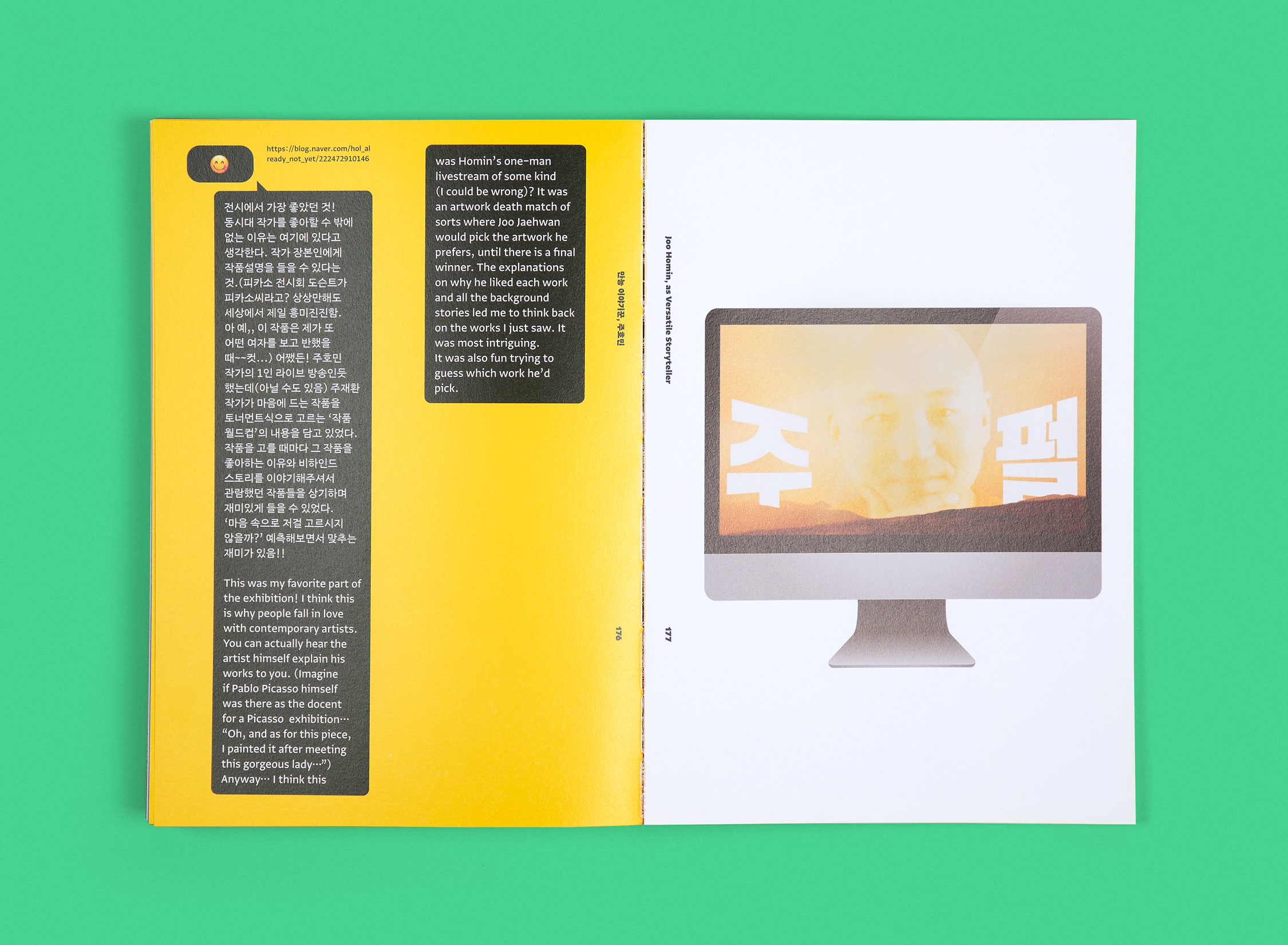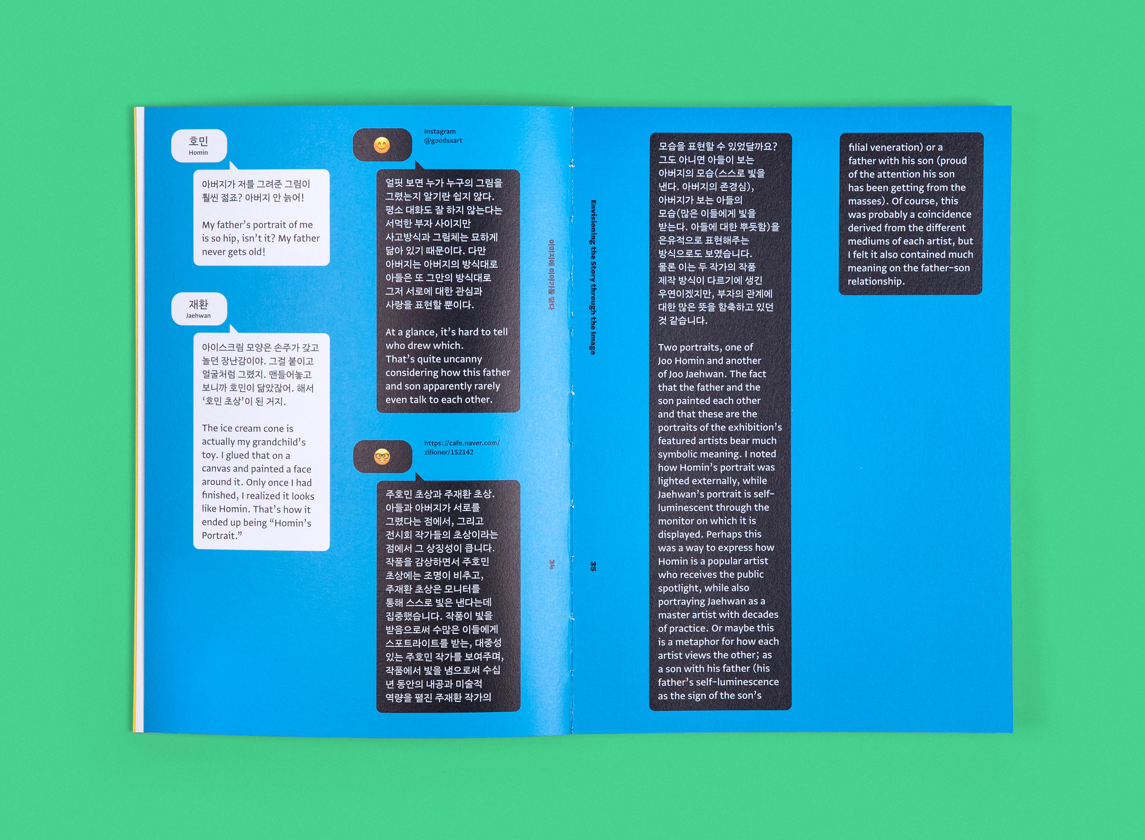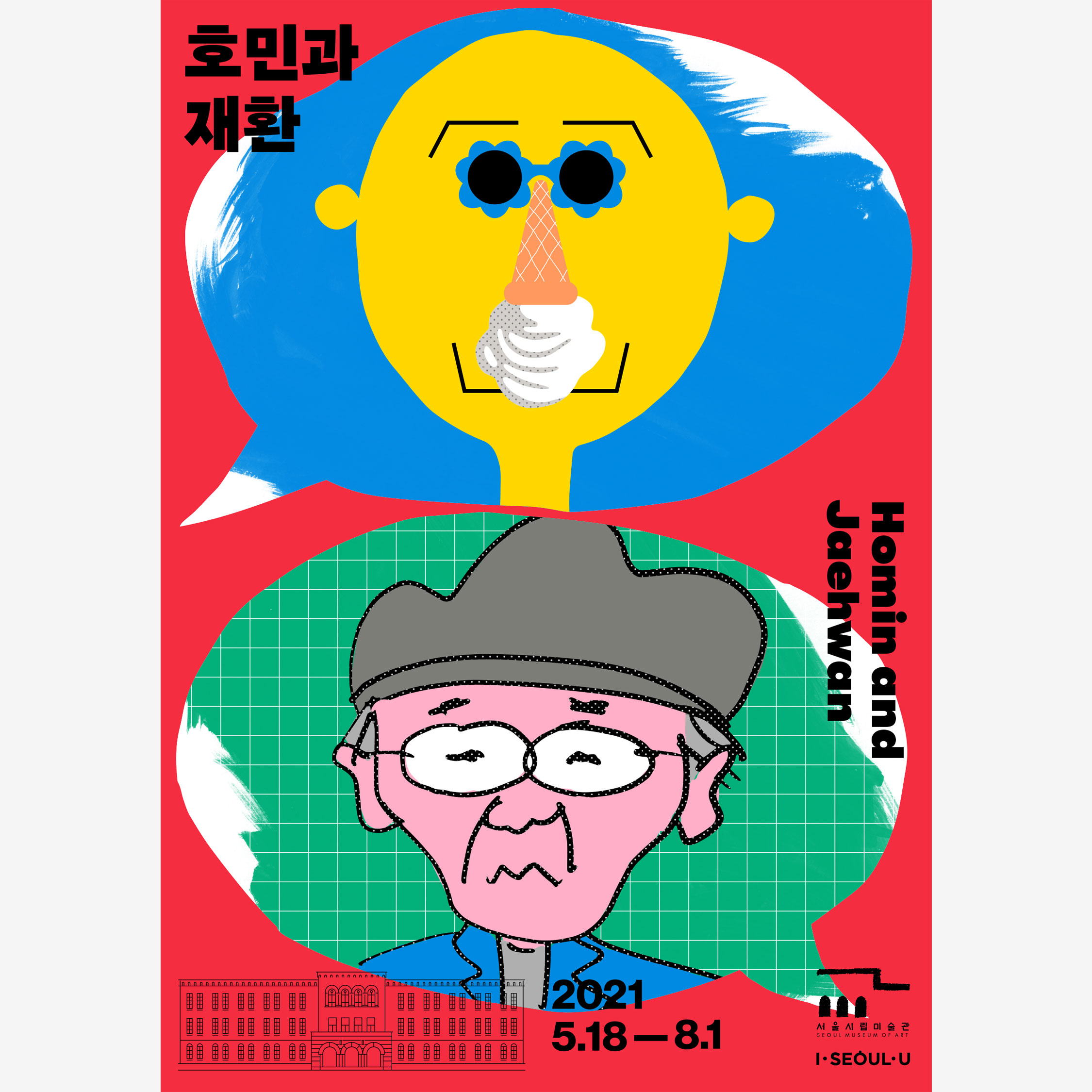 서울시립미술관 전시«호민과 재환»의 비주얼 아이덴티티와 도록을 디자인했습니다. 이 전시는 한국 현대사의 주요 이슈를 유머러스하면서도 날카로운 시선으로 조망해 온 작가 주재환과, 한국 신화를 바탕으로 삶과 죽음의 경계를 해석한 웹툰으로 널리 알려진 작가 주호민 부자의 2인전입니다. 보이어는 아버지와 아들의 2인전이라는 드문 기획을, 아들이 그린 아버지의 초상과 아버지가 그린 아들의 초상으로 직관적으로 시각화했습니다. 😎🥸