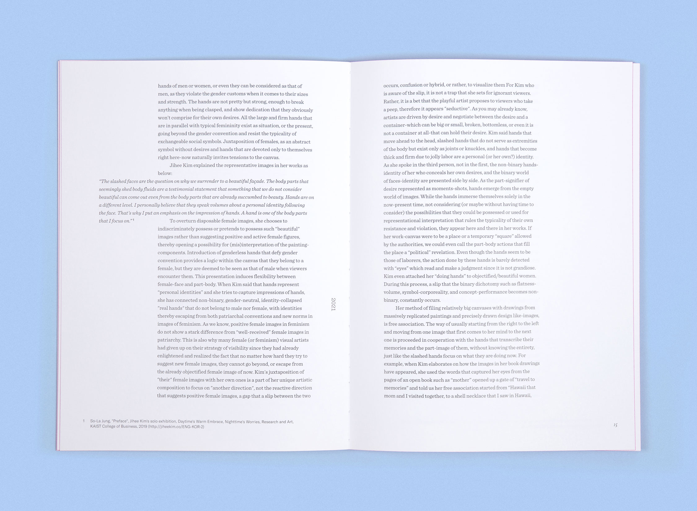 We designed the catalogue for artist Jihee Kim. Featuring works from her two solo exhibitions in 2021 and 2022, the catalogue was designed around the concept of a “memory journal.” To evoke the feeling of a diary filled with carefully pressed thoughts, we used a special cover material reminiscent of worn black leather. 🖋️